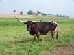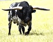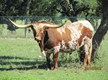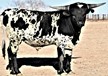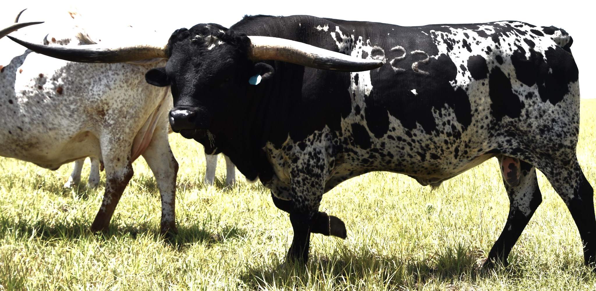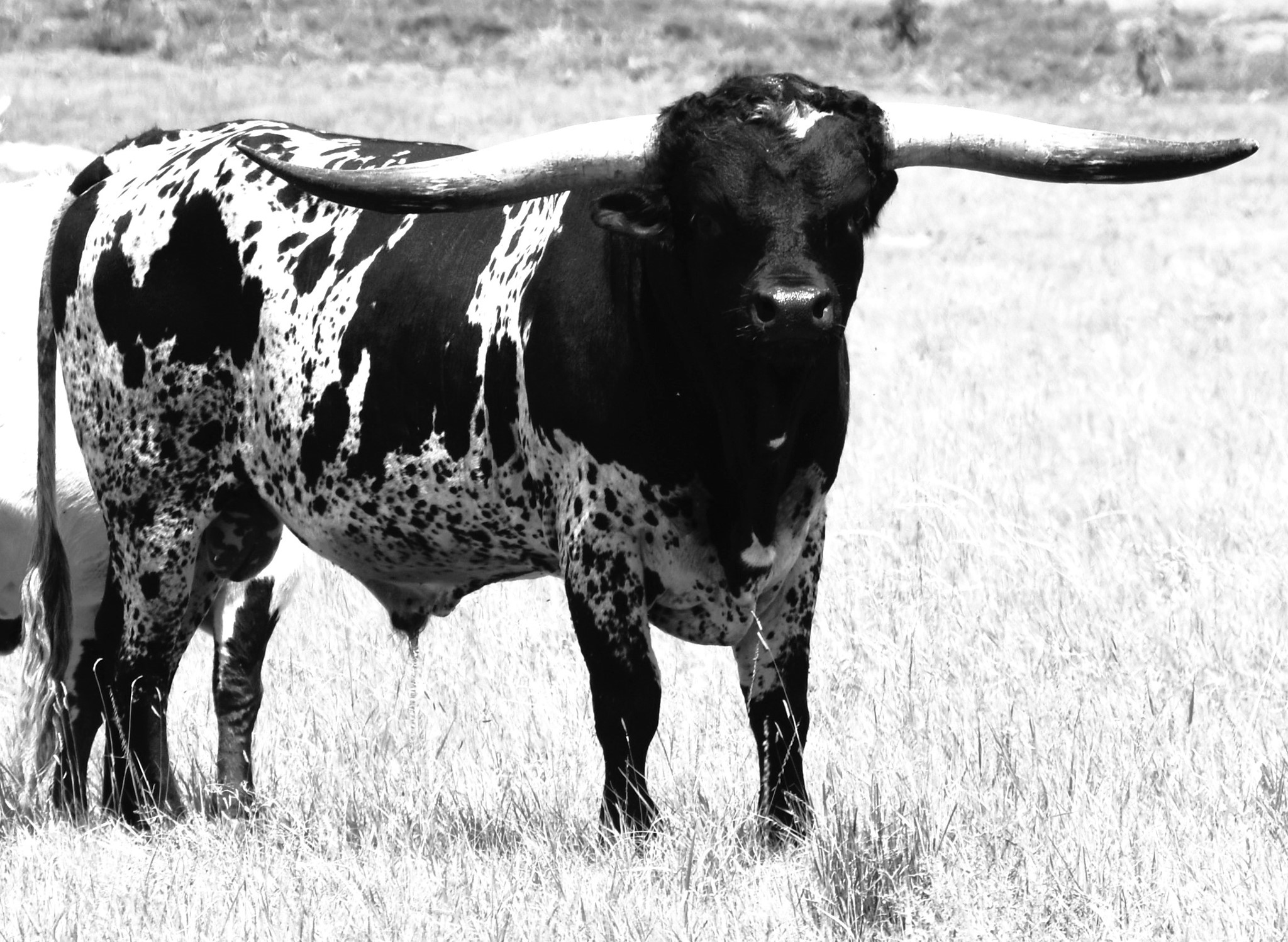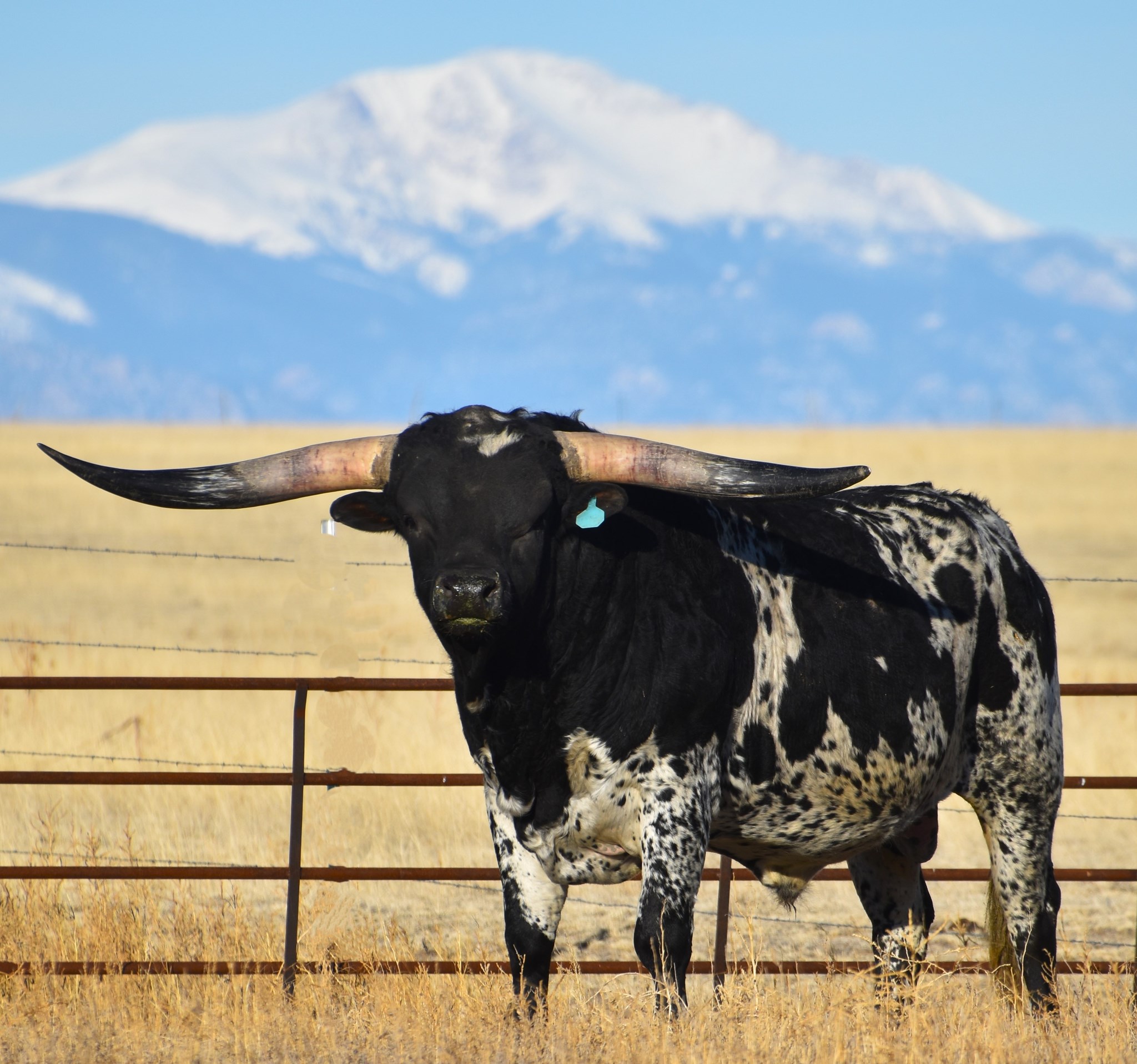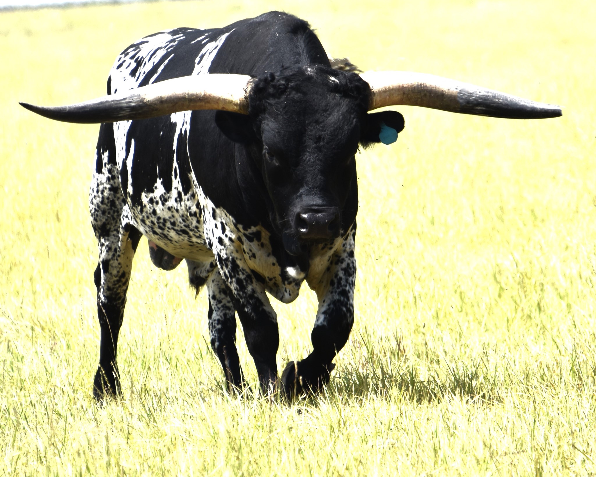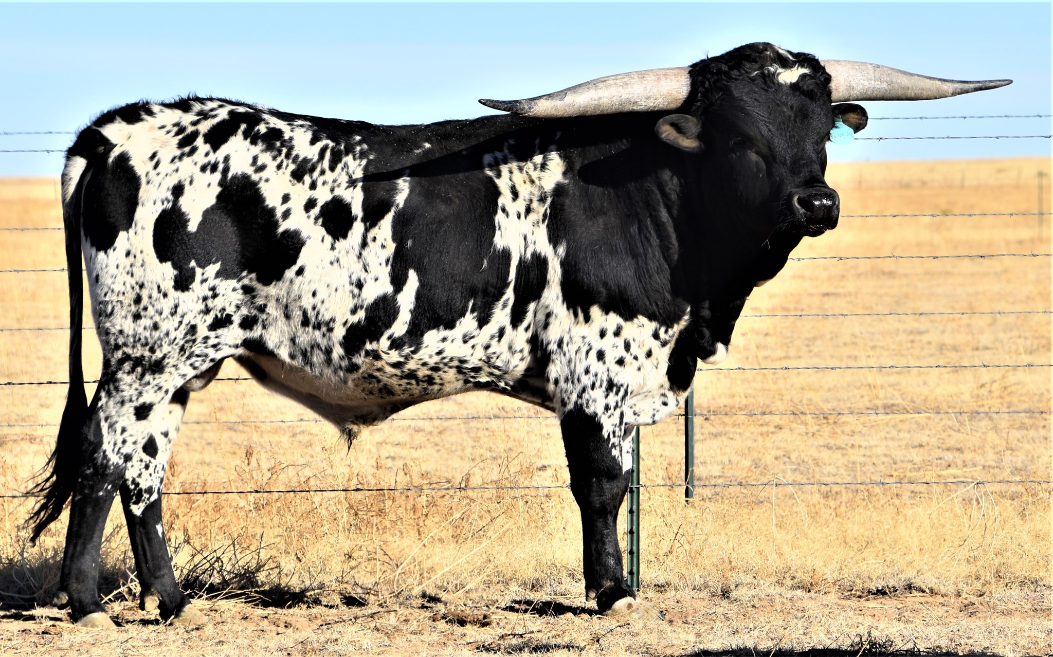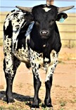 He is the TRUE BLACK, and has really been putting on the color,spots and speckles. He broke 4-5 inches of his horn but still has the awesome horn genetics. Great body, horn and color what more could you want in a bull