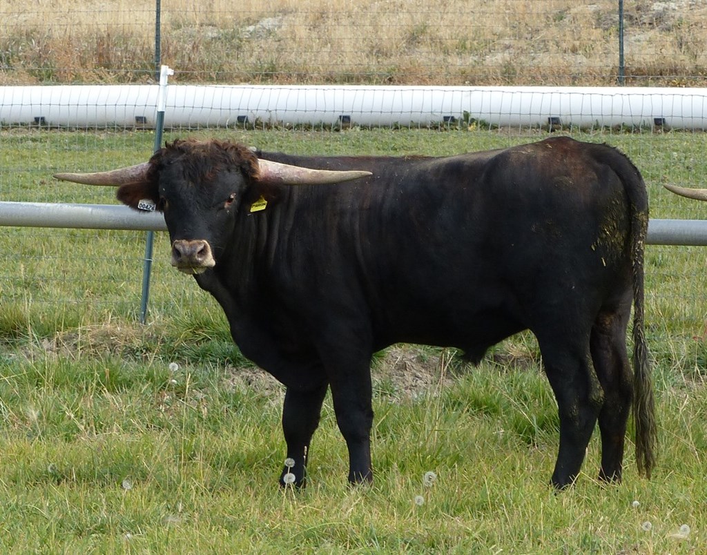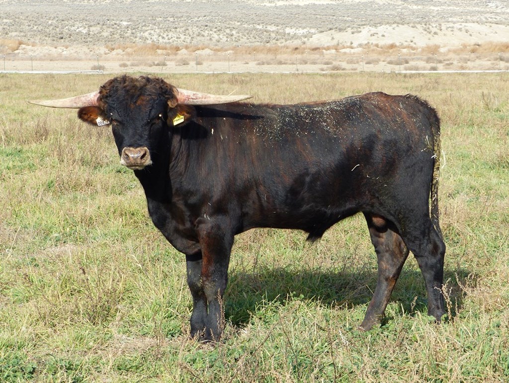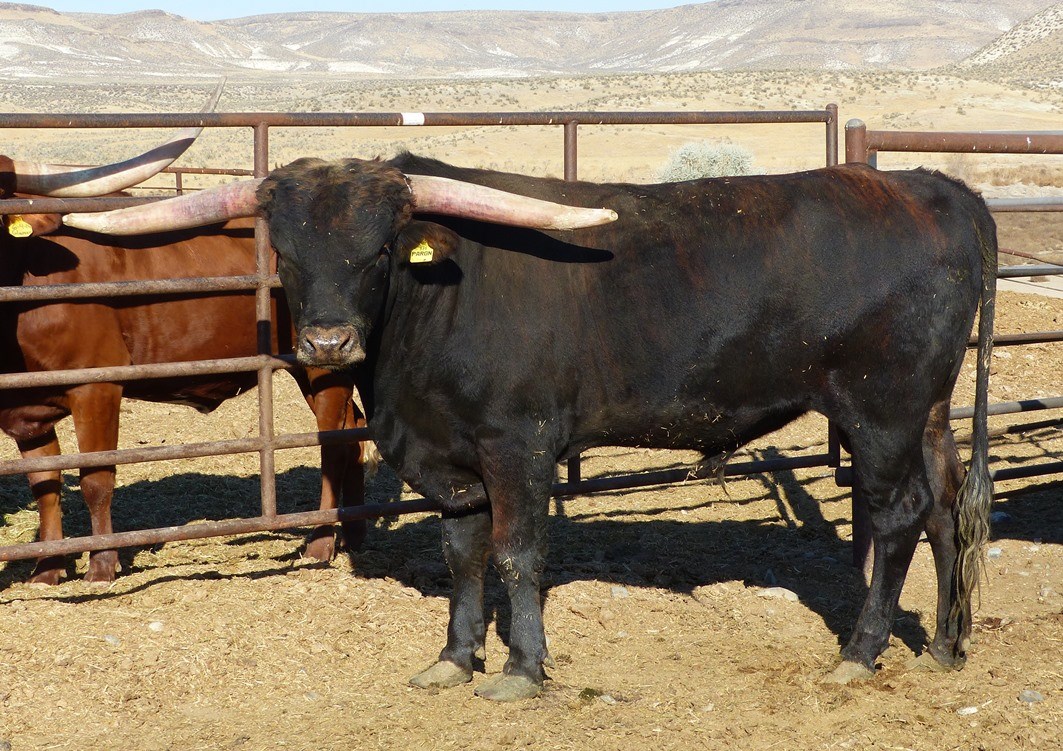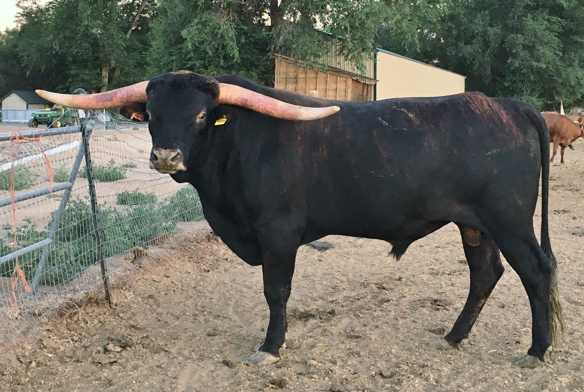 A striking dark black brindle bull with laid back horns. Lots to like here! Seems to throw brindle every time. Very gentle temperament. His mother, Jest A Drag was 81" in Nov of 2017. His Grandmother, Jester, just hit 90" in 2018.